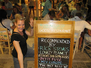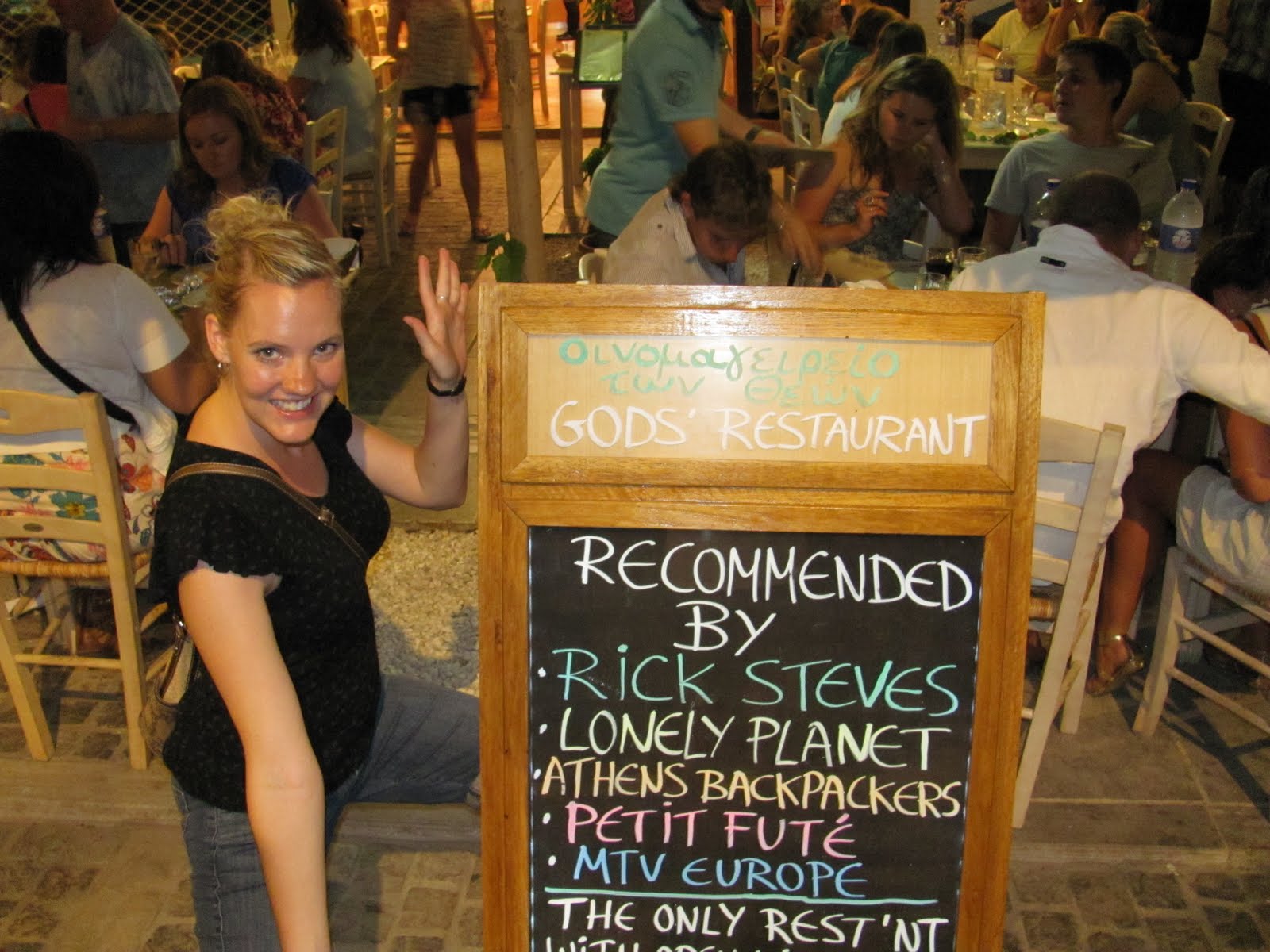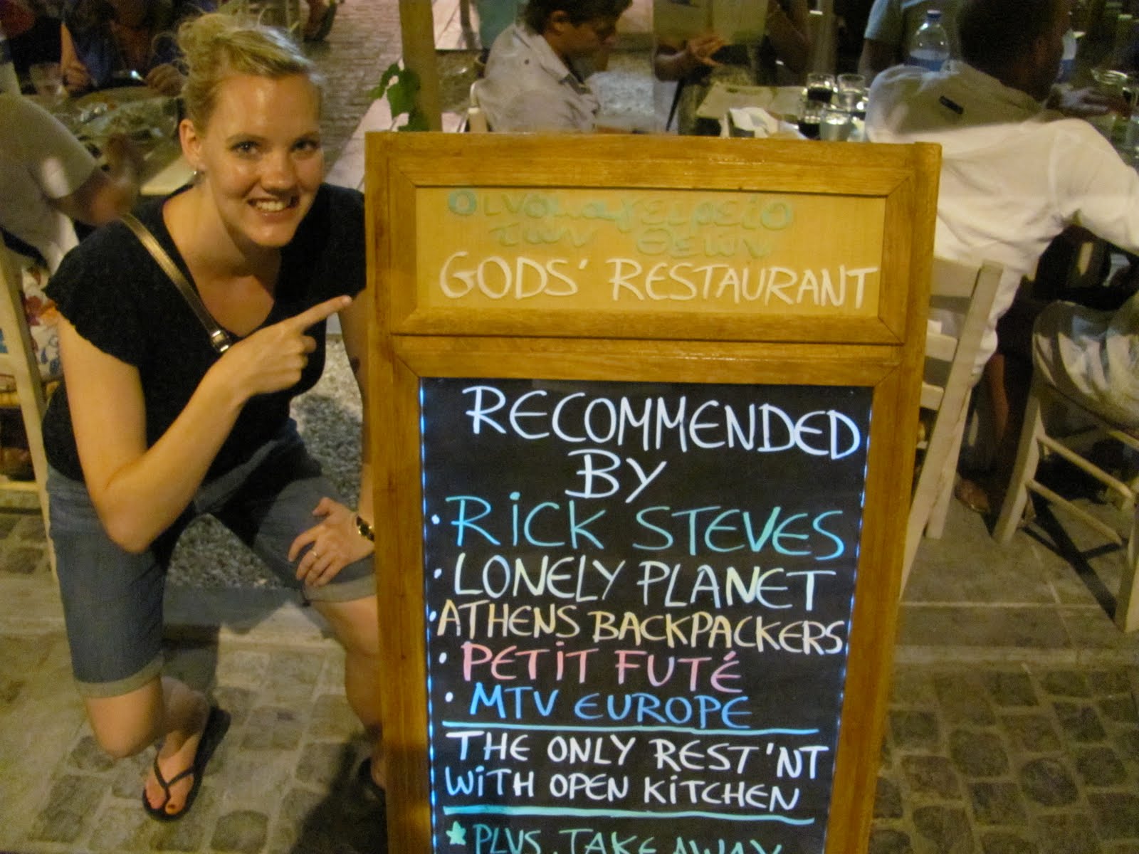 We ate most of our meals at the street cafes in Athens. After our island trip, we changed and stopped by Gods’ Restaurant. It was a lot cooler before we noticed the placement of the apostrophe. Oh well, the food was great!