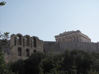 Standing on Aeropagus (Mars Hill) with the Acropolis in the background. The building hidden in scaffolding is the Temple of Athena Nike and the one on the far left is the Erecthion