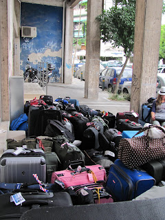 … waiting for the bus to come. The next phase of our tour involved getting from Athens, Greece to Istanbul, Turkey. It doesn’t sound that difficult, right? To forestall any Greek transit strikes, our bus was coming for us from Turkey. Word on the street was that the bus ride would be about 14 hours, or 12 hours, or 18 hours… so we tried not to worry about how long we’d be cooped up in the bus. Instead, we got our bags packed and lined up outside our hostel by 7 am. Did I mention that I hauled them down 4 floors? Yeah, well… I did. And if you ever want to see some challenging “spiral” stairs, visit Europe. Anyways, we got our luggage ready for the bus.