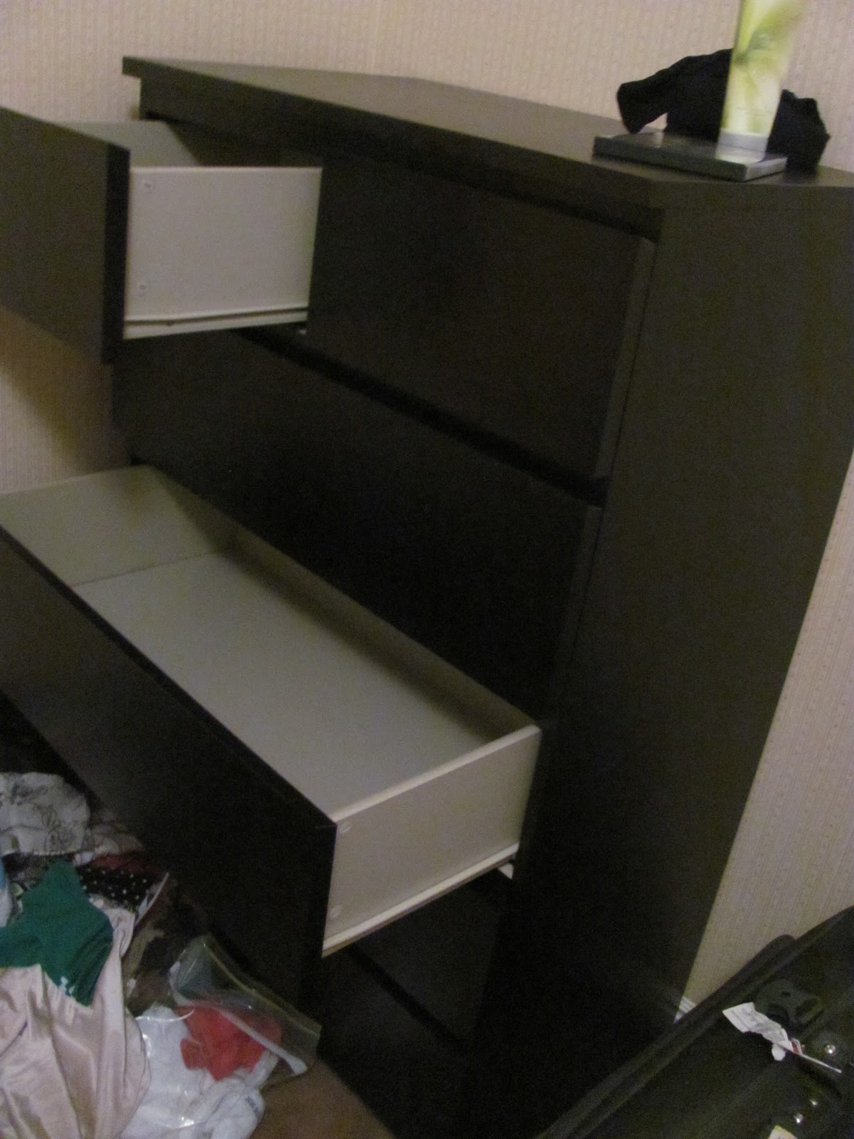 | Back in place, dresser in place! It took between 1-2 hours to get to this point… the drawers took another 1-2 hours, though. Despite the late night, it was worth it! |