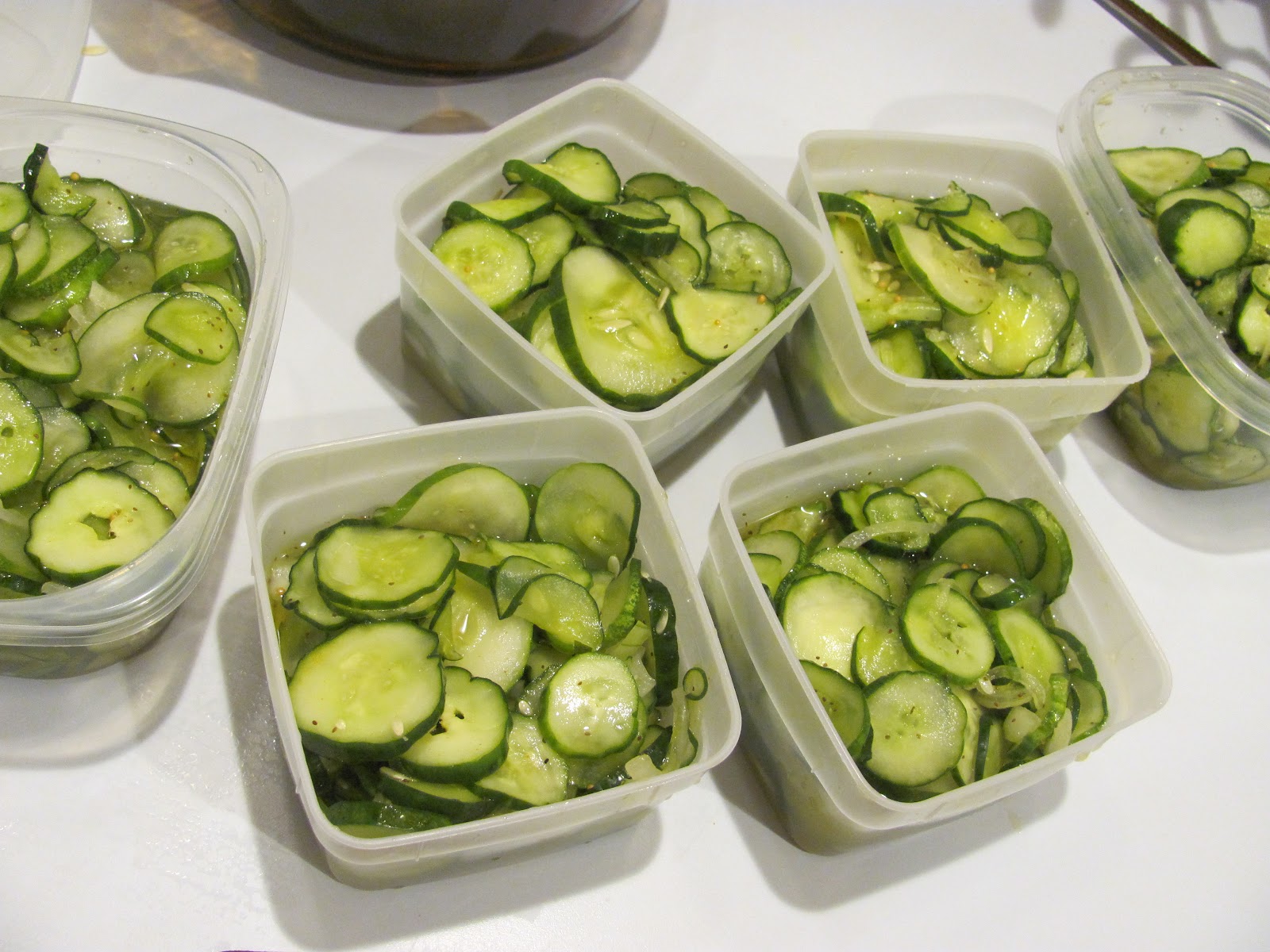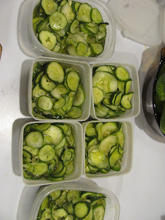 All nicely packed in their containers, about 3-4 hours after getting started. That salt bath for the cukes takes a long time!